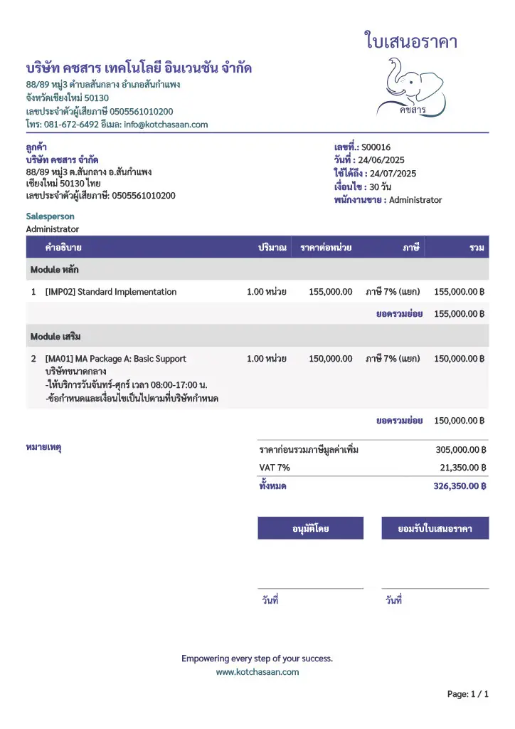 ราคา Package รวมค่า Implementation, Training, และ Support ในช่วง Project แต่ไม่รวมค่า Odoo License (เริ่มต้น $25/user/month) และค่า Server/Cloud